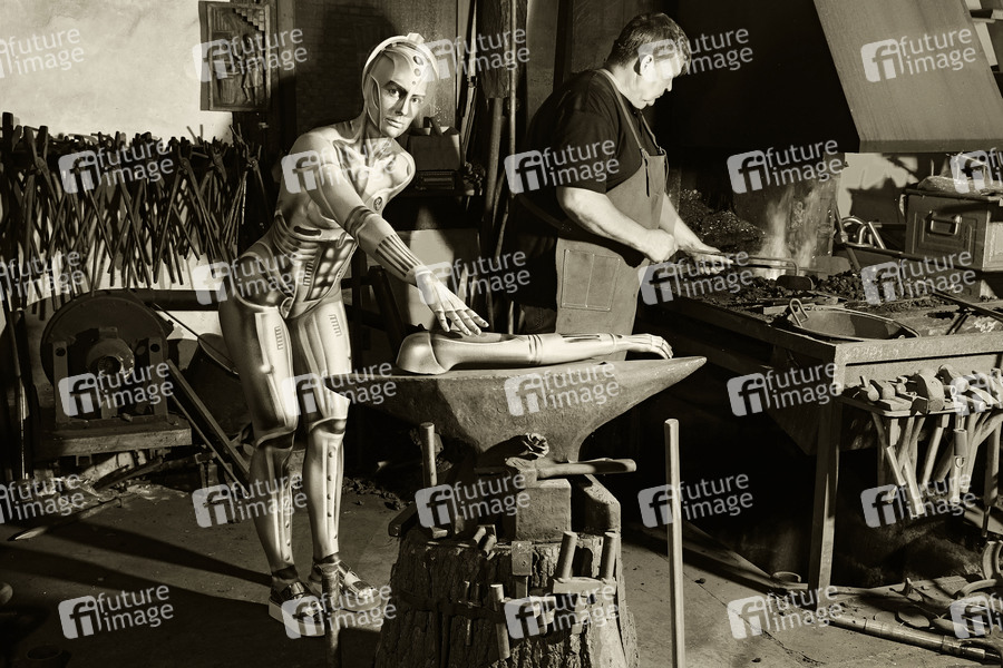GEEK ART - Bodypainting and Transformaking: Metropolis Photoshooting mit Sarah Specker als Menschmaschine und Schmied Arthur Brütt in der Roboter-Schmiede Brütt in Eldagsen. - Ein Projekt des Fotografen Tschiponnique Skupin und des Bodypainters und Transformakers Enrico Lein