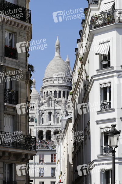 Tourismus, Touristen, Sightseeing, Stadt der Liebe, neobyzantinischer Bau, Architektur, Sommer in Paris, Reiseziel, Frankreich, Kultur, Sacre Coeur, Basilika, Straßenschlucht, Impression, Stadtleben, Stadtbild