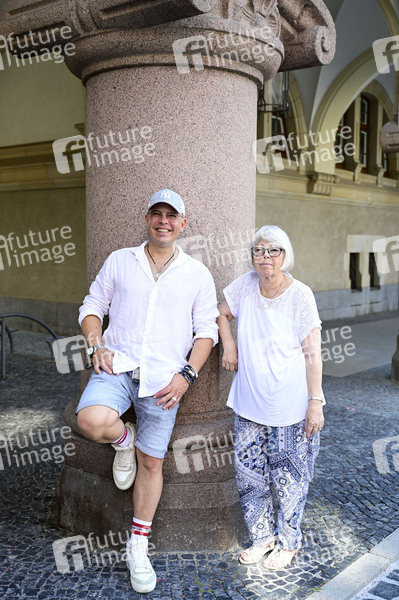 Mario Kotaska mit Mutter Gudrun Kotaska bei einer Sightseeing-Tour am Rathaus auf dem Untermarkt in der Görlitzer Altstadt. Görlitz, 03.09.2024