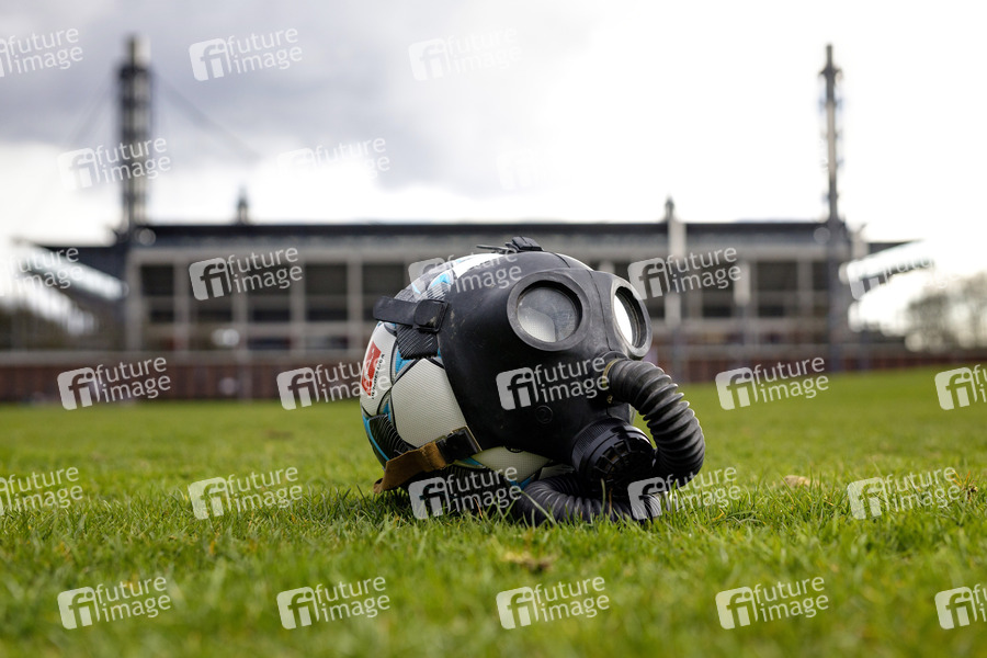 Ein Fußball mit Gasmaske vor dem Rheinenergie Stadion. Köln, 14.03.2020