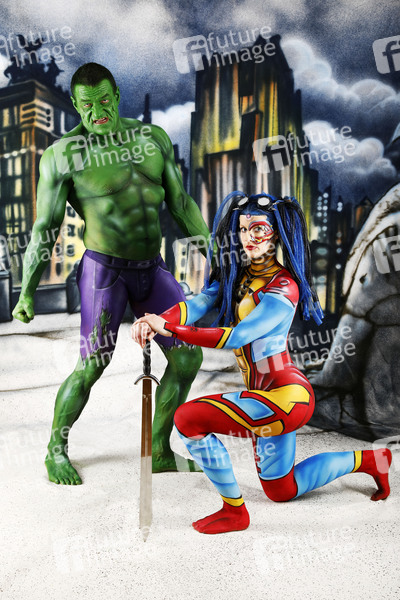 Bodypainting, Body-Painting, Cosplay, Cosplayer, nackt, Körperkunst, Körperfarben, Farbe, Bemalung, Kunst, Malerei, Science Fiction, Sci-Fi, SciFi, Fantastic, Comic Art, Anime, Studio, Comic-Helden, Comics, Marvel, DC, Superheld, Superheldin, Superhelden-Fans, Kampf der Superhelden, body painting, nude, body art, indoors, colors, battle of the superheroes, heroe, villain