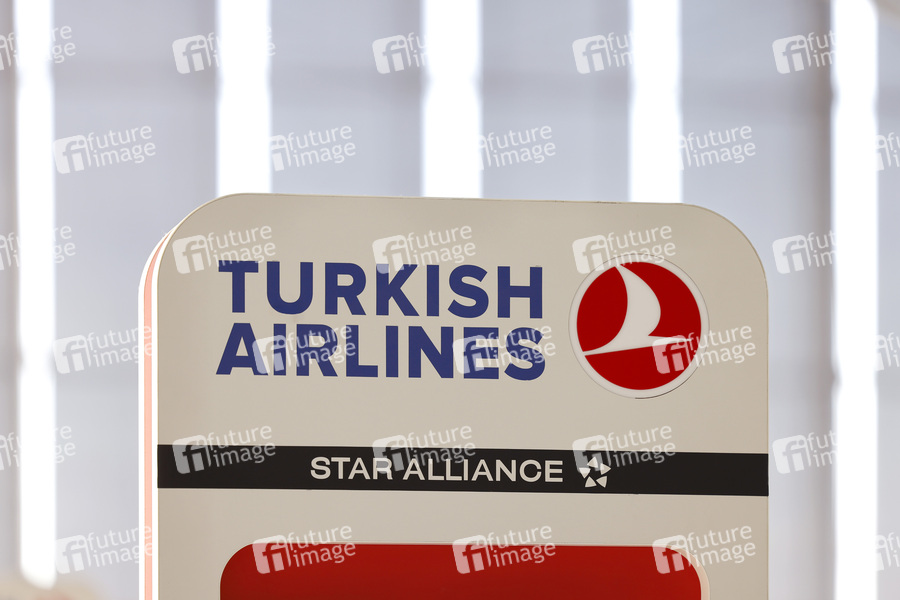 Ein Aufsteller mit dem Logo der Fluglinie Turkish Airlines am Köln Bonn Airport. Der Flughafen Köln/Bonn 'Konrad Adenauer' ist ein internationaler Verkehrsflughafen in Köln. (Themenbild, Symbolbild) Köln, 23.02.2022