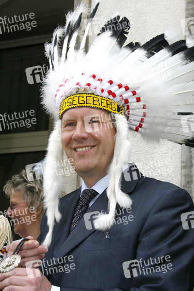 Das Ensemble der Karl-May-Spiele 2009 nimmt Ministerpräsident Wulff in den Kreis der Ehrenhäuptlinge auf. Dazu fanden sich die Mitwirkenden von 'Der Schatz im Silbersee' in der Niedersächsischen Staatskanzlei in Hannover ein.