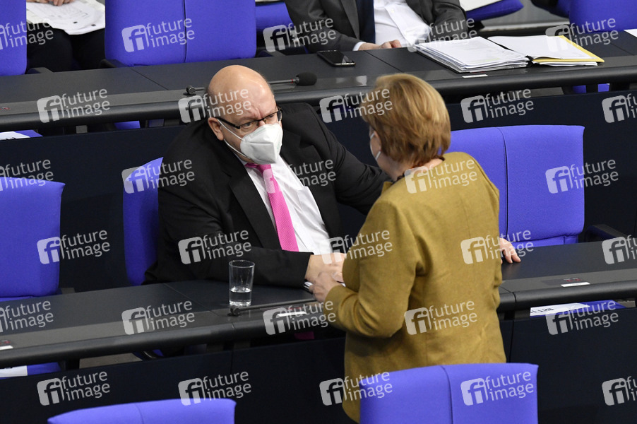 Peter Altmaier und Angela Merkel in der 206. Sitzung des Deutschen Bundestages im Reichstagsgebäude. Berlin, 28.01.2021