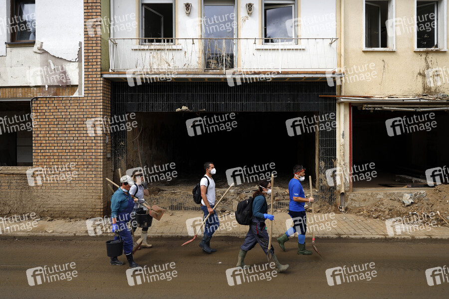 Nach dem Jahrhunderthochwasser in der Eifel durch heftige Regenfälle und Dauerregen mit Überschwemmungen und Überflutungen haben die Aufräumarbeiten im Ahrtal große Fortschritte gemacht. Einheiten von Polizei, THW, Bundeswehr und Feuerwehr mitsamt vielen freiwilligen Helfern haben Straßen geräumt, Schutt und Schlamm entfernt und die Menschen versorgt. Der Wiederaufbau wird trotzdem Jahre dauern. Im Bild Flutschäden in der Ortschaft Mayschoß, in der die Flut viele Häuser zerstörte, 08.08.2021