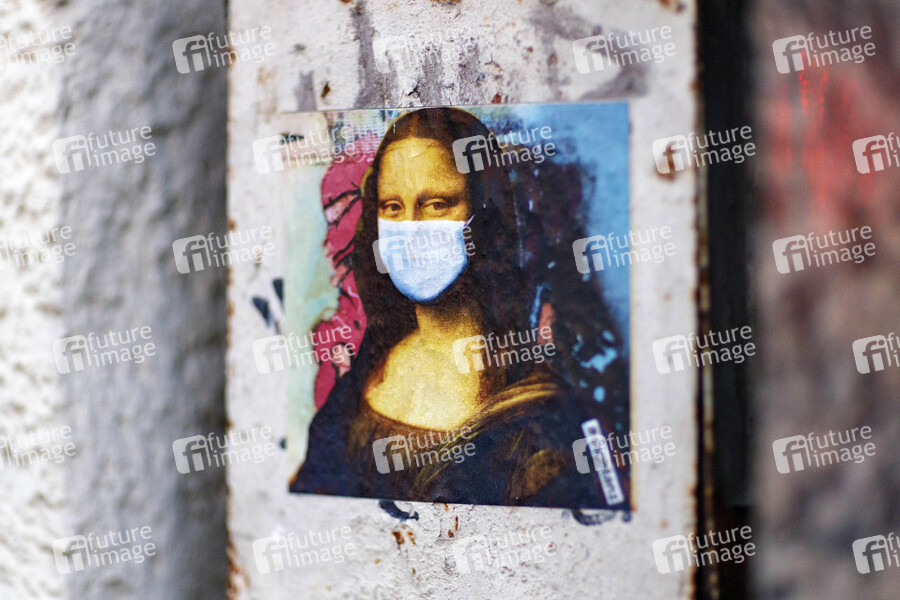 Die Kölner Künstlerin Ursula Düster hat einen Sticker mit der Kölschen Mona Lisa mit Mundschutz entworfen, der Aufkleber hängt an 60 Standorten in Köln anlässlich der Coronakrise. Köln, 31.10.2020