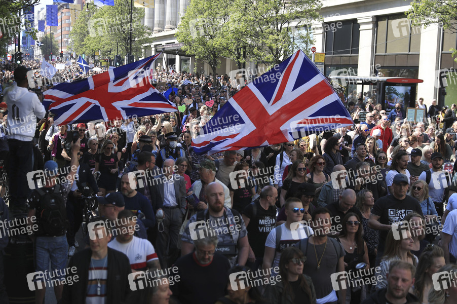 Mehrere tausend Menschen protestieren gegen die Corona-Maßnahmen und ziehen trotz geltender Beschränkungen für Massenversammlungen durch die britische Hauptstadt. Masken trägt dabei so gut wie niemand, dafür aber Protestschilder mit Aufschriften, die sich unter anderem gegen Corona-Pässe und -Tests richteten. London, 24.04.2021