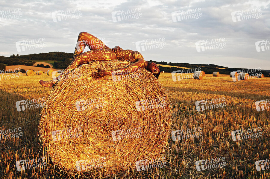 Bodypainting, Erotik, Frau, Mädchen, Afrikanerien, nackt, draußen, weiblich, Körperkunst, Kunst, Ornamente, Malerei, Feld, Acker, Stoppelfeld, Heuballen, Stroh, Landwirtschaft, Ernte, Abendsonne, erotic, African woman, girl, nude, outdoor, female, body art, body painting, ornaments, field, hay, straw, farming, harvest, evening sun