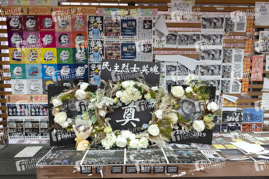 Die Lennon Wall für studentische Redefreiheit. Ein Schrein für zwei Studenten, von denen angenommen wird, dass sie bei Protestvorfällen ums Leben gekommen sind. Die Gedenkwand mit Protestplakaten für Demokratie wurde am Samstag, dem 11. Juli 2020 geräumt. Mindestens acht nicht identifizierte Personen haben, nach Angaben des Studentenwerks, das Forum für Demokratie an der Universität von Hongkong zerstört. Hongkong, 24.05.2020