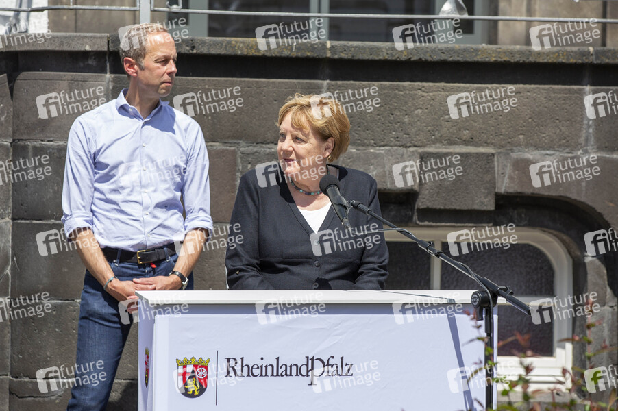 Angela Merkel bei einem Pressestatement am Rathaus nach dem Besuch der Bundeskanzlerin im Eifeldorf Schuld, das schwer von der Unterwetterkatastrophe getroffen wurde. Adenau, 18.07.2021