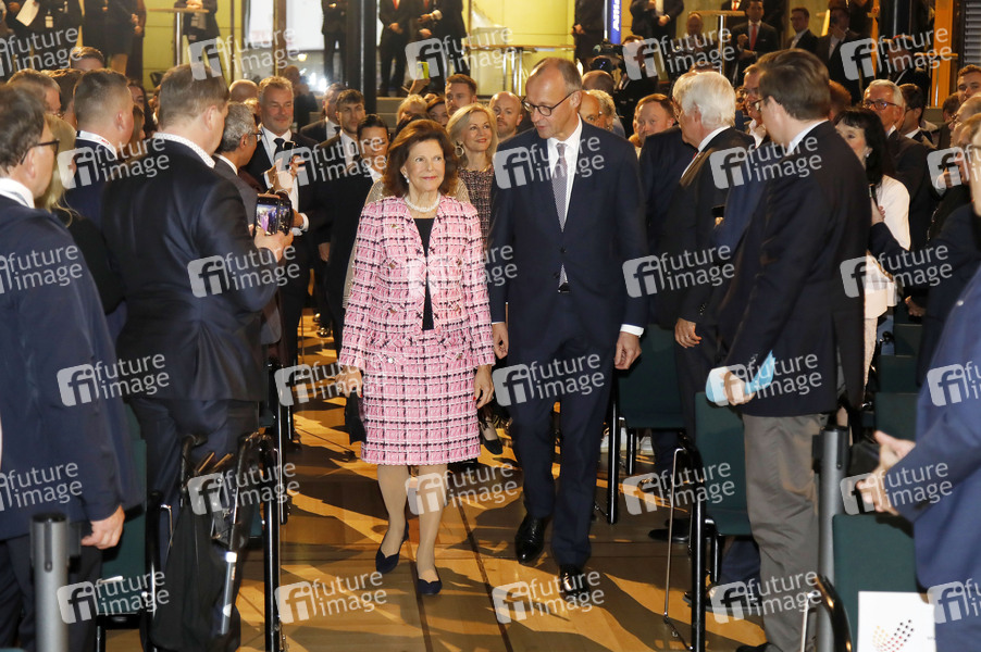 Königin Silvia von Schweden und Friedrich Merz bei der Verleihung des Sonderpreises vom Deutschen Mittelstandspreis der MIT an Königin Silvia von Schweden im Allianz Forum am Brandenburger Tor. Berlin, 25.11.2025