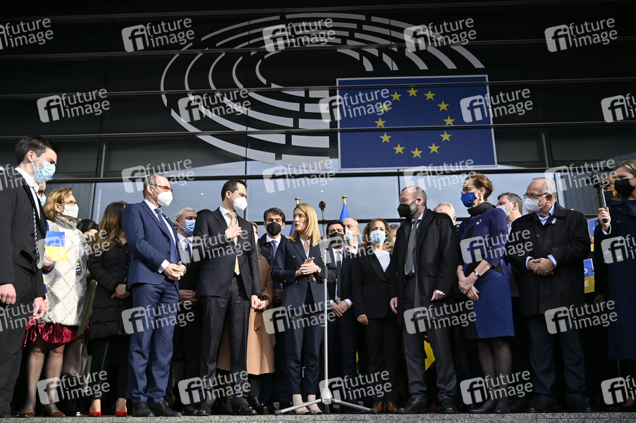 Roberta Metsola und Parlamentarier vor dem EU-Parlament - Hunderte von Menschen demonstrieren vor dem Europäischen Parlament, um ihre Unterstützung für das ukrainische Volk zu zeigen, darunter Dutzende von in Belgien lebenden Ukrainern. Die Präsidentin des Europäischen Parlaments, Roberta Metsola, hält in Begleitung von Abgeordneten eine Rede vor den Anwesenden, in der sie die Unterstützung der Europäischen Union für die Ukraine deutlich macht und den Antrag der Ukraine auf EU-Mitgliedschaft begrüßt. Brüssel, 01.03.2022