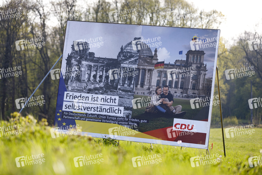 Wahlplakat der CDU / evp zur Europawahl auf einer Wiese in Klettenberg. Köln, 15.04.2019