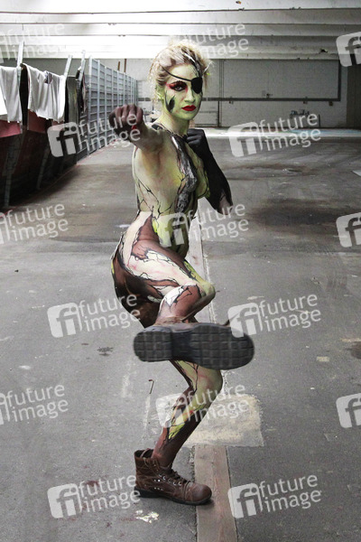 Bodypainting und Photoshooting mit Model Jutta auf einem Industriegelände in Hameln. Bodypaint-Künstler: Jörg Düsterwald, Make-Up und Hairstyling: Nadja Lück