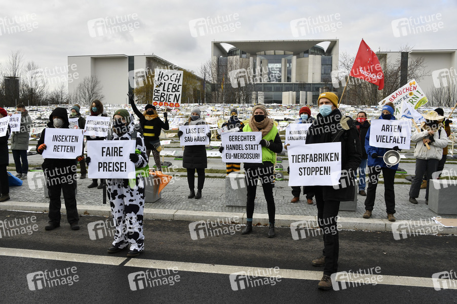 Landwirte, Klima- und Tierschützer demonstrieren unter dem Motto 'Wir haben es satt' für eine Wende in der Agrarpolitik. Vor dem Kanzleramt wird symbolisch mit rund zehntausend Fußabdrücken auf Papier eine bäuerliche, ökologische und klimafreundliche Landwirtschaft gefordert. Berlin, 16.01.2021