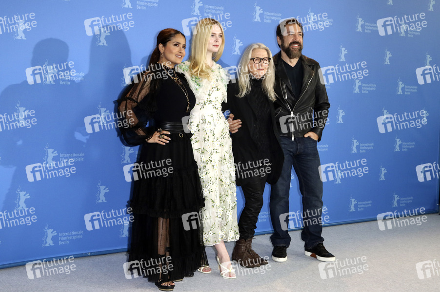 Salma Hayek, Elle Fanning, Sally Potter und Javier Bardem beim Photocall zu 'The Roads Not Taken'auf der Berlinale 2020 / 70. Internationale Filmfestspiele Berlin im Hotel Grand Hyatt. Berlin, 26.02.2020