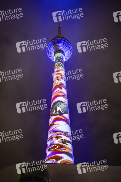 Der Berliner Fernsehturm. Das Festival of Lights Berlin gehört zu den bekanntesten Lichtfestivals weltweit. Es ist ein kostenloser Event in Berlin, der jährlich im Herbst stattfindet und 10 Tage lang bekannte Berliner Sehenswürdigkeiten durch Illuminationen, lichtkünstlerische Projektionen und 3D-Mappings aufwändig in Szene setzt. Berlin, 06.10.2024