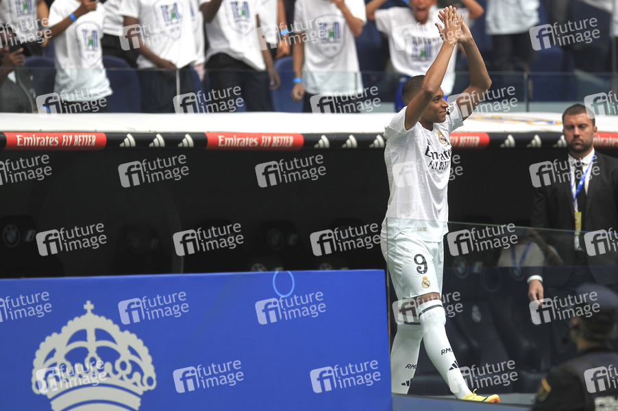Sport, Spiel, Fußball, Fussball, Teamsport, Mannschaftssport, Präsentation, Vorstellung, Estadio Santiago Bernabeu, Fußballspieler, Fussballspieler, Sportler, Nummer 9, Kylian Mbappé