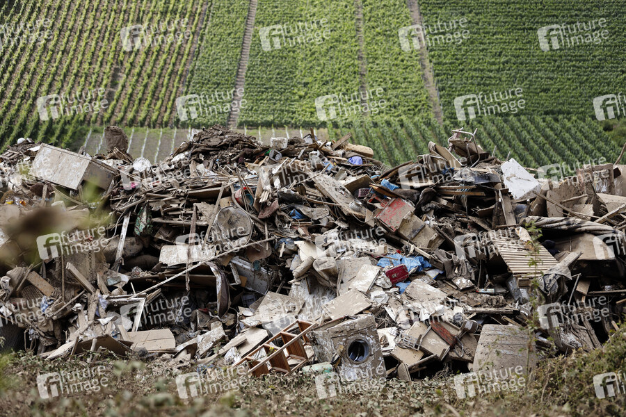 Nach dem Jahrhunderthochwasser in der Eifel durch heftige Regenfälle und Dauerregen mit Überschwemmungen und Überflutungen haben die Aufräumarbeiten im Ahrtal begonnen. Einheiten von Polizei, THW, Bundeswehr und Feuerwehr mitsamt vielen freiwilligen Helfern räumen Straßen, entfernen Schutt und Schlamm und versorgen die Menschen. Im Bild eine improvisierte Müllkippe mit Flutmüll bei der Ortschaft Dernau, in der die Flut viele Häuser zerstörte, 22.07.2021
