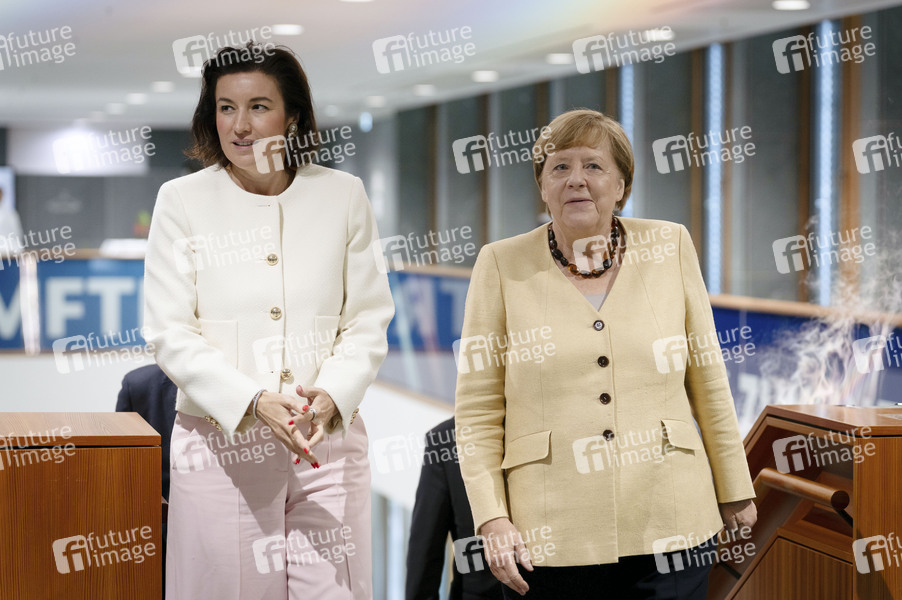 Dorothee Bär und Angela Merkel bei der Ausstellungseröffnung 'Unsichtbare Wissenschaftlerinnen - Versäumte Bilder' im Bundesministerium für Forschung, Technologie und Raumfahrt. Berlin, 16.09.2025