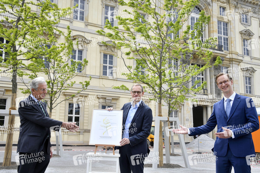 Wilhelm von Boddien, Michael Müller und Marc Fielmann bei der symbolischen Entgegennahme einer Baumspende für das Umfeld des Humboldt Forums auf der Baustelle vom Berliner Schloss. Berlin, 18.05.2020