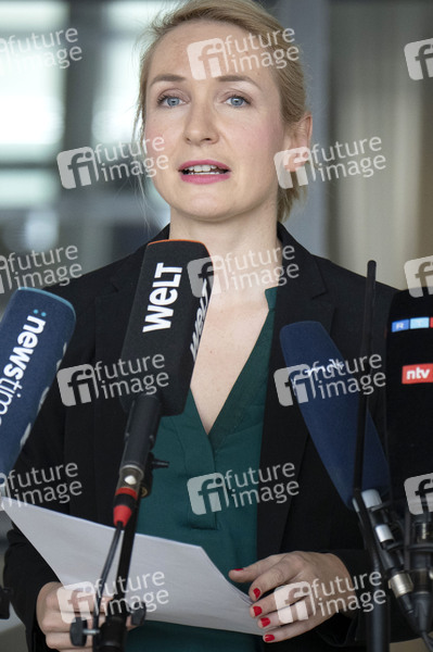 Ines Schwerdtner bei einem Pressestatement der Bundestagsfraktion der Partei Die Linke im Reichstagsgebäude. Berlin, 09.04.2025