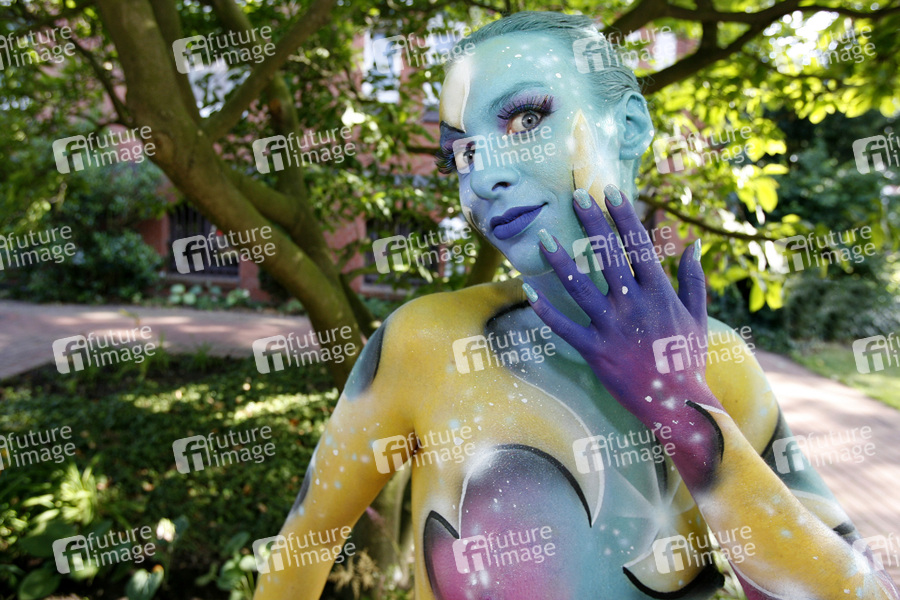 Bodypainting und Fotoshooting mit Model Sarah am Tag der offenen Tür der Meisterschule Justus-von-Liebig-Schule, Abteilung Floristik in Hannover-Ahlem. Künstler: Jörg Düsterwald