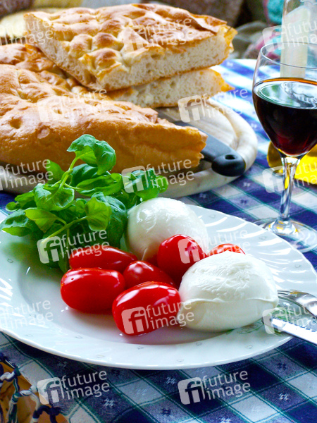 Tomaten, Basilikum, Fladenbrot, Rotwein, Mozzarella, Caprese