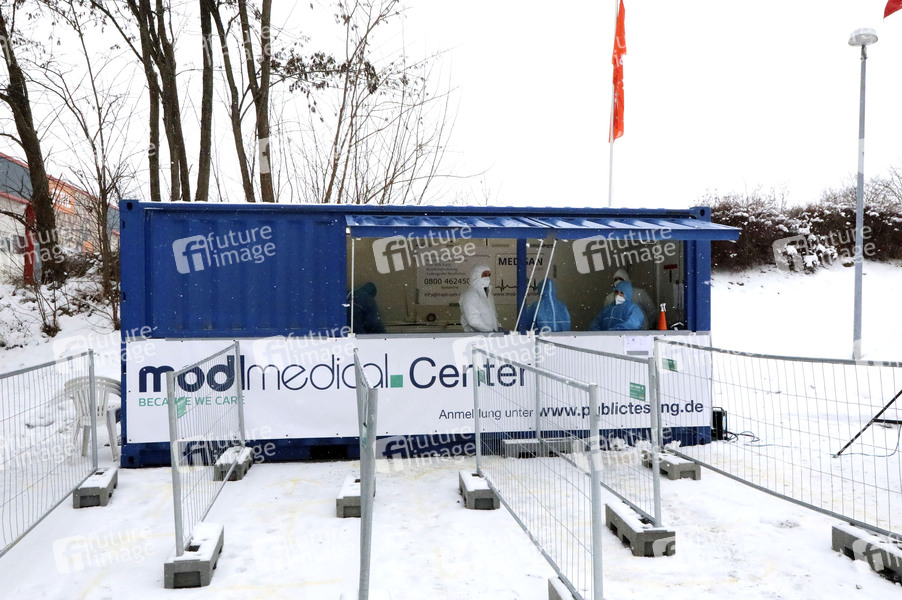 Corona Schnelltest Center ModlMedical auf dem Gelände der Birkenstock Schuhfabrik, die über 1000 polnische Grenzpendlern beschäftigt. Der Freistaat Sachsen hat eine regelmäßige Testpflicht für Grenzpendler und Grenzgänger aus und in Risikogebiete eingeführt. Die Regelung der Sächsischen Corona-Quarantäne-Verordnung enthält die Verpflichtung für diese Personengruppe, sich einmal wöchentlich einer Testung auf eine Infektion mit Sars-CoV-2 zu unterziehen. Diese Regelung gilt sowohl für Einpendler nach Sachsen (Grenzgänger) als auch für Auspendler aus Sachsen (Grenzpendler). (Symbolbild, Themenbild) Görlitz am 18.01.2021