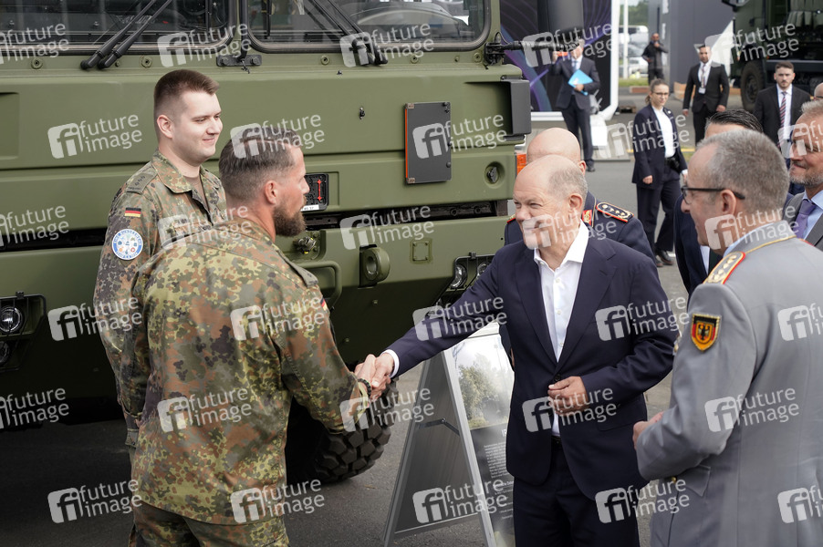 Olaf Scholz und Carsten Breuer vor dem Flugabwehrraketensystem Patriot beim Eröffnungsrundgang der ILA Berlin auf dem ILA-Gelände am Flughafen BER Berlin-Brandenburg. Berlin, 05.06.2024