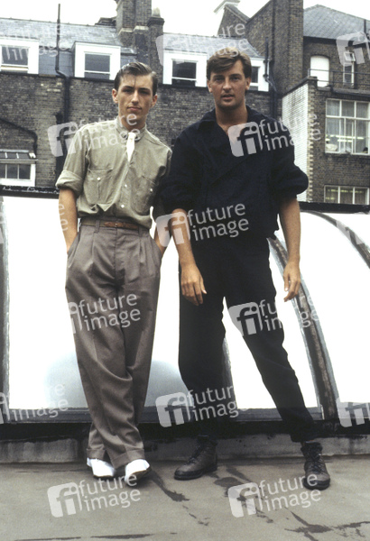 Phil Smith und Mark Fox von Haircut 100 bei einem Photoshooting auf dem Dach von Arista Records. London, 02.11.1983