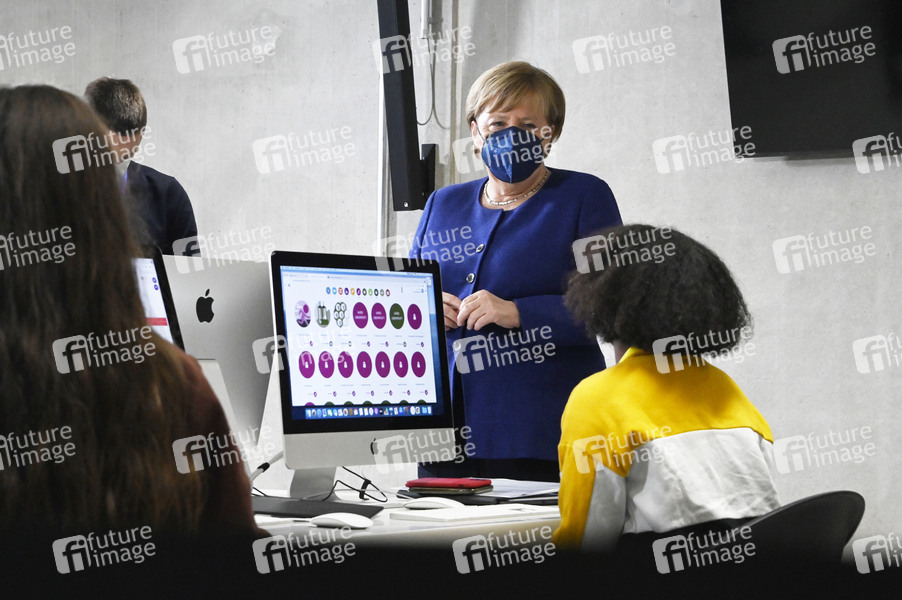 Angela Merkel beim Rundgang durch das TUMO Lernzentrum zur Förderung der digitalen Bildung von Jugendlichen in Berlin-Charlottenburg. Berlin, 22.11.2021