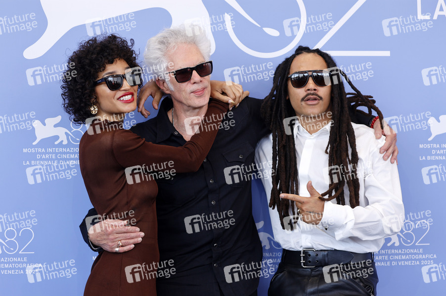 Indya Moore, Jim Jarmusch und Luka Sabbat beim Photocall zum Kinofilm 'Father Mother Sister Brother' auf der Biennale di Venezia 2025 / 82. Internationale Filmfestspiele von Venedig im Palazzo del Casino. Venedig, 31.08.2025