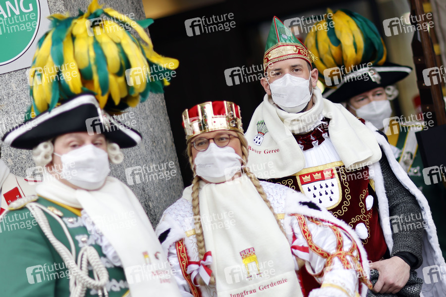 Karneval, Brauchtumszone, Brauchtum, Corona, Corona-Maßnahmen, 3G, 2G, 2G+, 3G+, 2G-Regel, 2G+-Regel, Delta-Variante, Omikron, Infektion, Infektionsgeschehen, Mindestabstand, Maskenpflicht, geimpft, genesen, getestet, Geimpfte, Genesene, Getestete, Covid, Covid19, Covid-19, Sars-Cov2, Virus, Viren, Infektionsschutzgesetz, Weiberfastnacht, Karnevalssaison, Corona-Lage, Inzidenz, Alaaf, Gastronomie, Sicherheit, Corona-Zahlen, Hotspot, Hotspots, Kontrolle, Besucher, Inzidenzzahlen, Superspreader-Event, Touristen, Ungeimpfte, ungeimpft, Corona-Impfung, Impfung, Infektionsrisiko, Festkomitee Kölner Karneval, 2G-Karneval, Dreigestirn, Narren, Tradition, Kultur, Brauchtum, Feiern, Schutz, Vorbeugung, Prävention, Corona-Karneval, Karnevalsfiguren, Tradition, Karnevalsgesellschaft, Brauchtum, Karnevalsgesellschaften, Rosenmontag, Zülpicher Straße, Quartier Latäng, Menschenmassen, Menschenmasse, Menschenmenge, überfüllt, Gedränge, dicht an dicht, Kontaktbeschränkungen, zwischenmenschliche Kontakte, Social Distancing, Jungfrau, Bauer, Dreigestirn, Trifolium