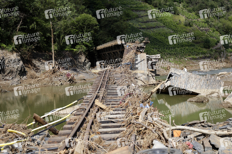 Nach dem Jahrhunderthochwasser in der Eifel durch heftige Regenfälle und Dauerregen mit Überschwemmungen und Überflutungen haben die Aufräumarbeiten im Ahrtal große Fortschritte gemacht. Einheiten von Polizei, THW, Bundeswehr und Feuerwehr mitsamt vielen freiwilligen Helfern haben Straßen geräumt, Schutt und Schlamm entfernt und die Menschen versorgt. Der Wiederaufbau wird trotzdem Jahre dauern. Im Bild Flutschäden an einer Eisenbahnbrücke nahe der Ortschaft Rech, in der die Flut viele Häuser zerstörte, 30.07.2021