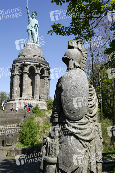 soll an den Cheruskerfürsten Arminius (Lateinisch, in deutsch: Hermann) erinnern, Gesanthöhe 53.46 m, Sandsteinunterbau 26.89m, Figur 26.57 m, besteht aus einer Eisenrohrkonstruktion mit Oberfläche aus Kupferplatten, Erbauer Ernst von Bandel, Baubeginn 1838, nach der Revolution von 1848 ruhte der Bau bis 1863, festliche Einweihung 1875