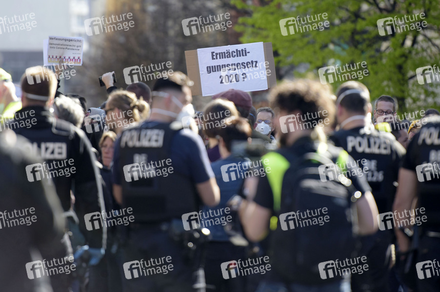 Protest der 'Kommunikationsstelle Demokratischer Widerstand Berlin' gegen die Einschränkung der Grundrechte durch Eindämmungsverordnung der COVID-19-Pandemie im Rahmen des Infektionsschutzes vor der Berliner Volksbühne. Die Demonstranten protestieren gegen die Einschränkung des Versammlungsrechts durch das Kontaktverbot und relativieren die Gefahr durch das Corona-Virus. Auch diese 4. Hygienedemo wurde von der Polizei aufgelöst. Die Polizei nahm mehrere Personen fest. An dem Protest beteiligten sich eine Reihe von Verschwörungstheoretikern. Berlin, 18.04.2020