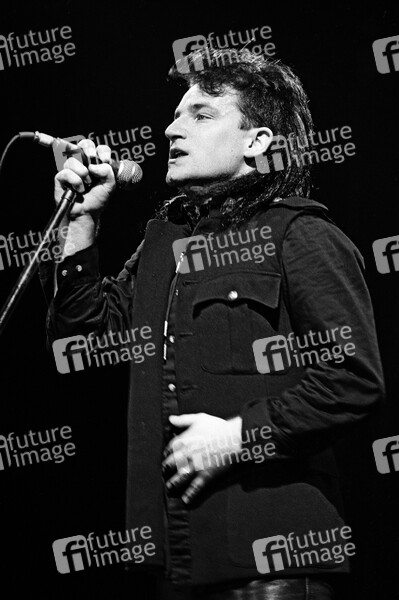 Bono von U2 live bei einem Konzert der 'Unforgettable Fire'-Tour in der Westfalenhalle. Dortmund, 21.11.1984