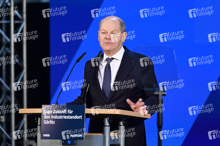 Olaf Scholz beim Besuch des Alstom-Standort in Görlitz. Vertreter von Alstom und KNDS informieren über die Zukunft des Standortes. Das Unternehmen Alstom, das für die Produktion von Schienenfahrzeugen bekannt ist, wird sich bis 2026 aus Görlitz zurückziehen. Der Rüstungskonzern KNDS wird als neuer Investor den Standort übernehmen. Die Übernahme schafft eine nachhaltige Perspektive für den Standort und einen Großteil der Beschäftigten. Görlitz, 05.02.2025