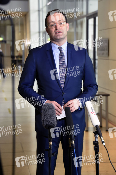 Gesundheitsminister Jens Spahn beim Pressestatement zur Verteilung von FFP2-Masken an Hartz-IV-Empfänger am Rande der 206. Sitzung des Deutschen Bundestages in der 'Westlobby', dem Aufenthaltsbereich vor dem Plenarsaal auf der Westseite im Reichstagsgebäude. Berlin, 28.01.2021