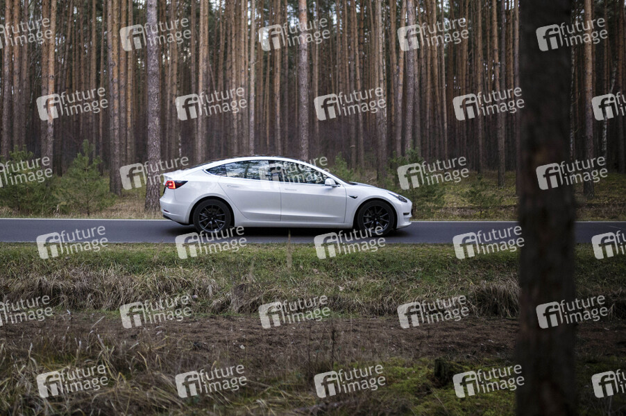 Ein Tesla Model 3 fährt auf einem Waldweg nahe Grünheide. Grünheide, 19.01.2020