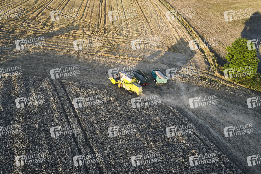 Luftbild, Luftaufnahme, Mähdrescher, Erntemaschine, Korn, Kornfeld, Vollkorn, Ähren, Halme, Feld, Landwirtschaft, Dürre, Trockenheit, Wasser, Regen, Grundwasser, Wasserknappheit, Grundwasserspiegel, Grundwasserpegel, Trockenphase, Ernte, Ernten, Getreide, Landwirte, Bauern, Acker, Äcker, Weizen, Gerste, Roggen, Wheat, Rye, Barley, Körner, Triticale, Anbau, Bio, Dünger, Agrar, Agrarwirtschaft, Erntewetter, Ernteausfall, Ernteausfälle, Futterkrise, Missernte, Futter, Saat, Saatgut, Anbau, Fruchtbarkeit, Bauern, Bauernverband, Symbolbild, Symbolfoto