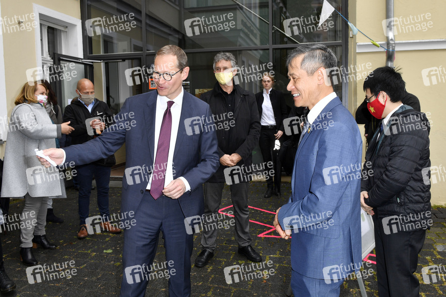 Politiker, SPD, Regierender Bürgermeister, Botschafter von Vietnam, Hôi tù' thiȇn Sen Vàng, Ansteckungsgefahr, Beschränkung, Beschränkungen, Bevölkerungsschutz, Corona, Coronaepidemie, Coronaerkrankung, Coronainfektion, Coronakrise, Coronavirus, Corona-Virus, CoViD19, Covid-19, Einschränkungen, Epidemie, erkranken, Erkrankung, Gefahrenabwehr, Gesundheit, Gesundheitsgefahr, Gesundheitsschutz, Infektion, Infektionsgefahr, Infektionskrankheit, Infektionsschutz, Sars-CoV-2, Schutz, schützen, Schutzhandschuhe, Atemschutz, Atemschutzmaske, Virenschutz, Schutzmaske, Schutzmasken, Atemschutzmasken, Maske, Masken, Mundschutz, Mund-Schutz, Mundschutzpflicht, Maskenpflicht, Mundschutz-Pflicht, Mund-Nase-Schutz, Mund-Nasen-Schutz, MNS