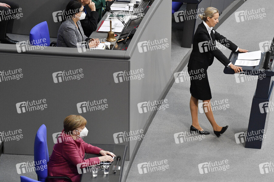 Angela Merkel und Alice Weidel in der 222. Sitzung des Deutschen Bundestages im Reichstagsgebäude. Berlin, 16.04.2021