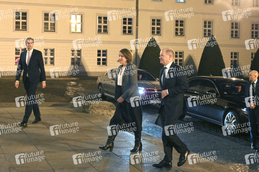 Steffen Hebestreit, Dörte Dinger und Olaf Scholz nach der Vertrauensfrage im Bundestag bei der Ankunft beim Bundespräsidenten im Schloss Bellevue. Berlin, 16.12.2024