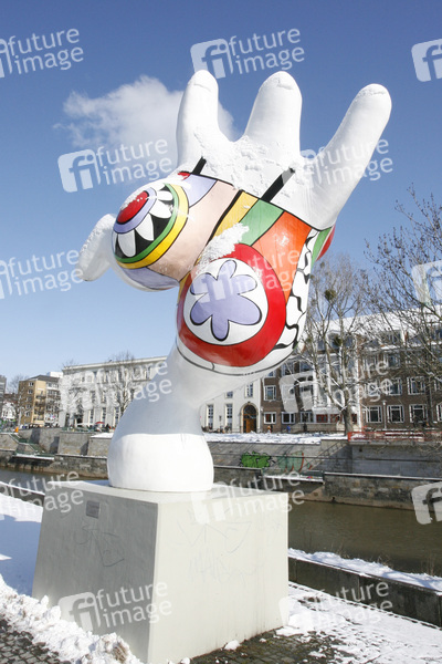 Kunstwerk von Niki de Saint Phalle von 1974, Frauenfiguren mit überdimensionierten Geschlechtsteilen, Leineufer, Kunst, Pop-Art, Schnee