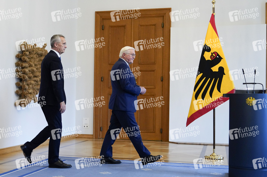 Jens Stoltenberg und Frank-Walter Steinmeier bei der Verleihung des Großkreuzes des Verdienstordens der Bundesrepublik Deutschland an Jens Stoltenberg im Schloss Bellevue. Berlin, 22.10.2024