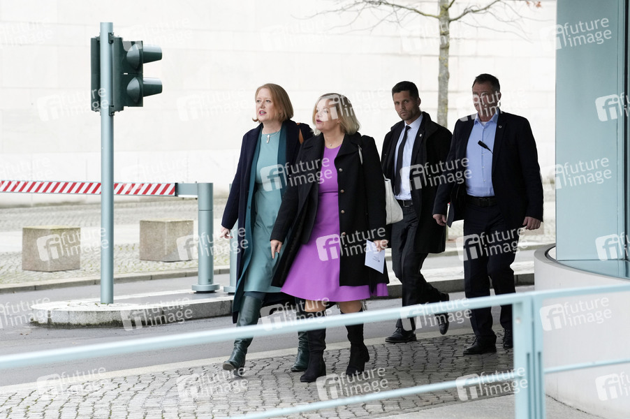 Lisa Paus und Nancy Faeser bei einer Pressekonferenz zum Nationalen Aktionsplan gegen Menschenhandel und Gewaltstrategien vor dem Bundeskanzleramt. Berlin, 11.12.2024