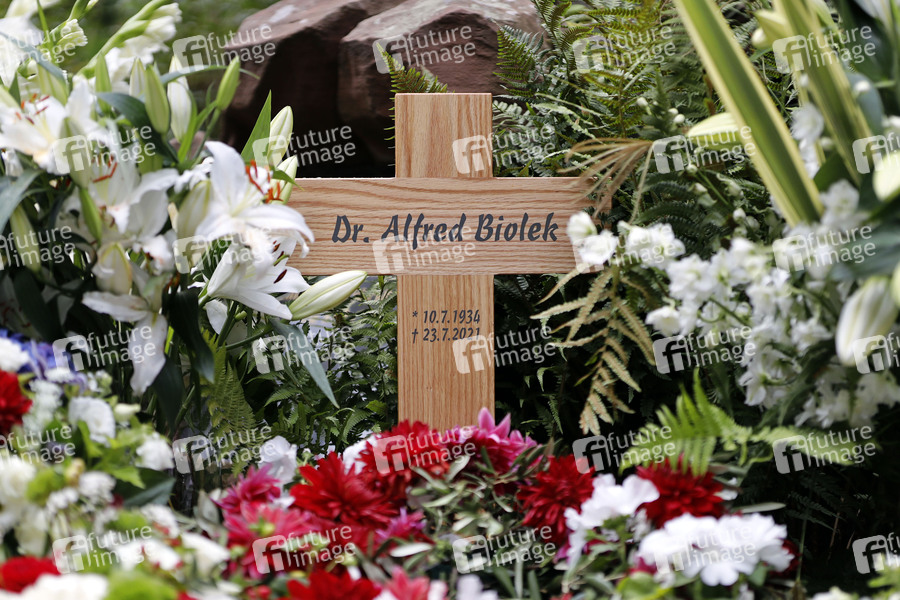 Ein Holzkreuz markiert das Grab von Dr. Alfred Biolek auf dem Melaten Friedhof. Die Urne mit Bioleks Asche war am Freitag im engsten Familienkreis beigesetzt worden. Die Grabstätte gehört der Familie Gruber, mit der Biolek eng befreundet war. Köln, 09.08.2021