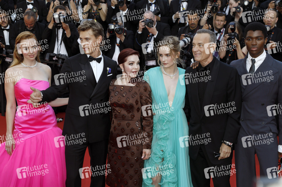 Natasha Bassett, Austin Butler, Priscilla Presley, Olivia DeJonge, Tom Hanks und Alton Mason bei der Premiere des Kinofilms 'Elvis' auf dem Festival de Cannes 2022 / 75. Internationale Filmfestspiele von Cannes im Palais des Festivals. Cannes, 25.05.2022